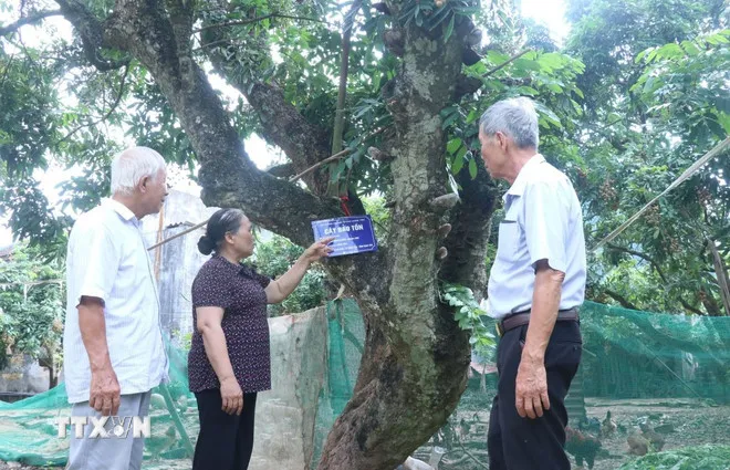 Cây nhãn cùi cổ của gia đình bà Trần Thị Bắc, ở xã Tân Hưng, tỉnh Hưng Yên được chứng nhận là cây bảo tồn. (Ảnh: Đinh Văn Nhiều/TTXVN)