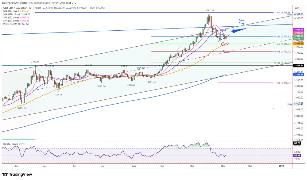 Nếu giá không thể duy trì trên ngưỡng 4.006 USD, khả năng cao vàng sẽ quay lại kiểm tra vùng hỗ trợ gần nhất tại 3.886 USD. Trong kịch bản xấu hơn, việc phá vỡ ngưỡng này có thể kéo giá về khu vực hợp lưu giữa đường trung bình 50 ngày (hiện quanh 3.856 USD) và mức thoái lui Fibonacci 50% tại 3.846 USD.