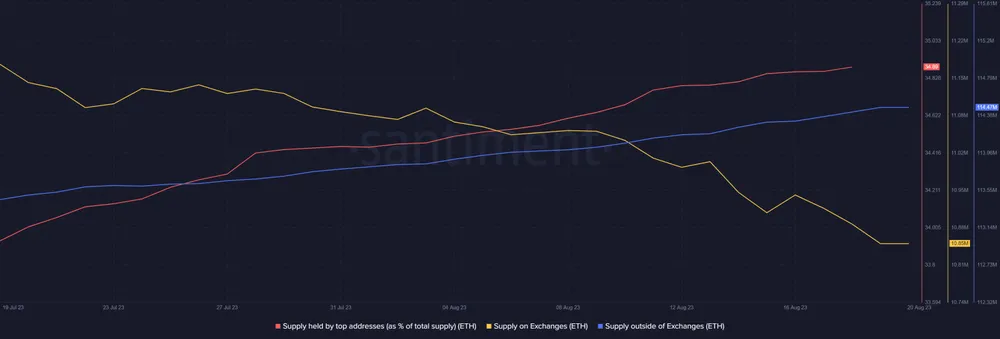 Theo Santiment, nguồn cung của ETH trên các sàn giao dịch giảm đáng kể trong khi nguồn cung bên ngoài các sàn giao dịch tăng lên. Ngoài ra, niềm tin của cá voi vào vua của các altcoin rất cao khi nguồn cung do các địa chỉ nắm giữ hàng đầu tăng lên.