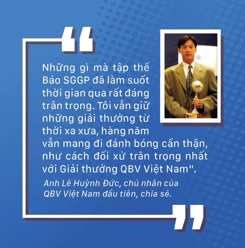 Những nỗ lực trong thầm lặng đó không phải ai cũng biết đến, không phải ai cũng cảm thông. Tuy nhiên, tập thể Báo SGGP suốt ngần ấy năm đã, đang và vẫn sẽ luôn xem Giải thưởng QBV Việt Nam là một trách nhiệm, một nhiệm vụ vượt tầm thể thao, một nhiệm vụ chính trị buộc phải hoàn thành. Anh Lê Huỳnh Đức, chủ nhân của QBV Việt Nam đầu tiên, từng nhiều lần chia sẻ: “Tôi vẫn luôn đánh giá cao những đóng góp của Báo SGGP trong quá trình phát triển bóng đá Việt Nam thời hội nhập nói chung và với Giải thưởng QBV nói riêng. Với tôi, Báo SGGP và Giải thưởng QBV thân thuộc giống như người nhà, nên bất cứ khi nào Báo SGGP cần hỗ trợ trong khâu chuẩn bị và tổ chức trao giải, tôi đều sẵn sàng. Những gì mà tập thể Báo SGGP đã làm suốt thời gian qua rất đáng trân trọng. Tôi vẫn giữ những giải thưởng từ thời xa xưa, hàng năm vẫn mang đi đánh bóng cẩn thận, như cách đối xử trân trọng nhất với Giải thưởng QBV Việt Nam”.
