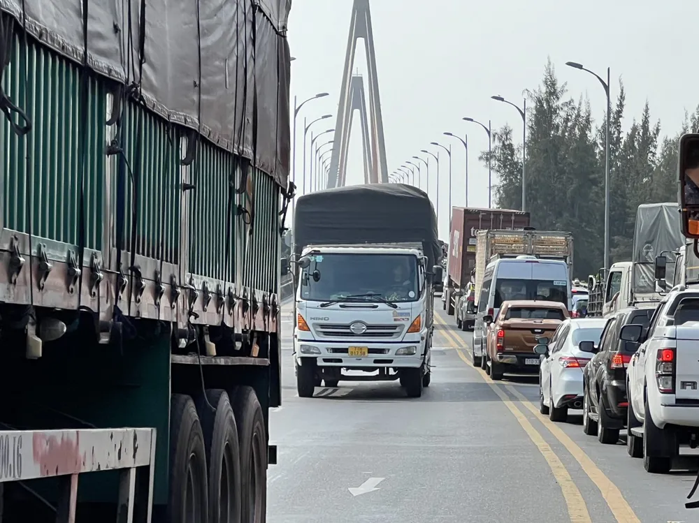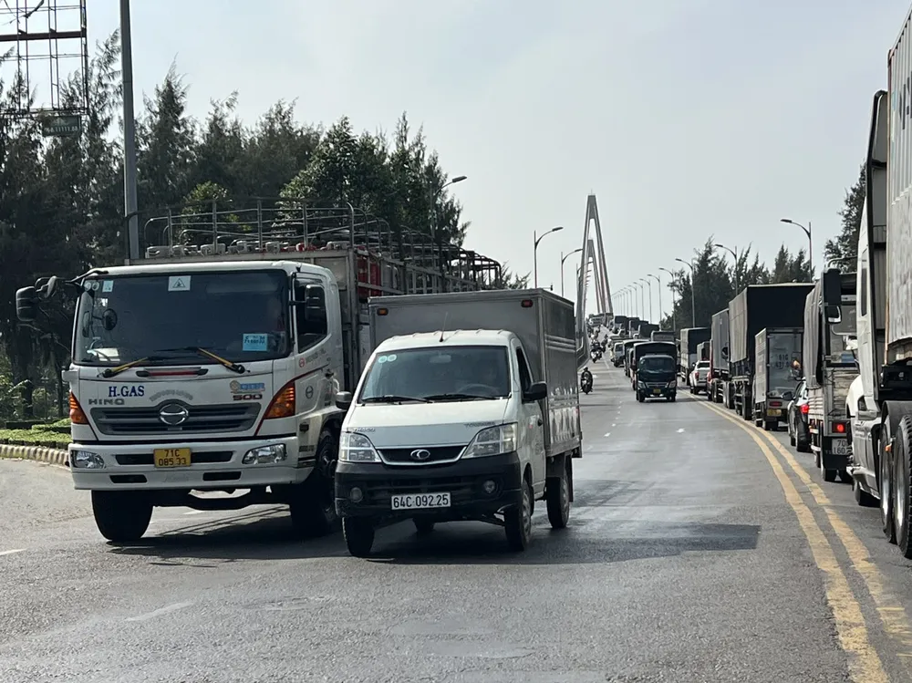 Đến 14 giờ cùng ngày, hướng Tiền Giang đi Bến Tre đoạn qua cầu Rạch Miễu vẫn còn rất đông phương tiện nối đuôi nhích từng chút một để qua cầu.