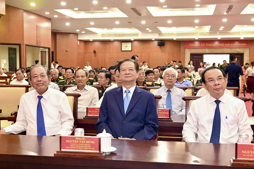 Từ trái qua: Nguyên Phó Thủ tướng Thường trực Trương Hòa Bình, Nguyên Thủ tướng Nguyễn Tấn Dũng và Bí thư Thành ủy TPHCM Nguyễn Văn Nên dự chương trình họp mặt. Ảnh: VIỆT DŨNG