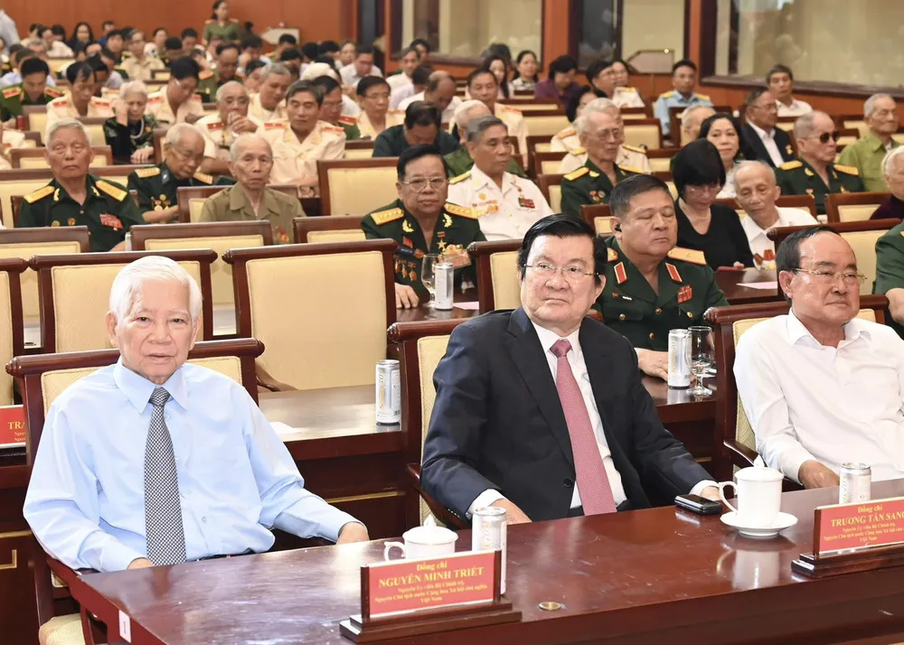 Từ trái qua: Nguyên Chủ tịch nước Nguyễn Minh Triết, nguyên Chủ tịch nước Trương Tấn Sang và Thượng tướng Trần Đơn, nguyên Thứ trưởng Bộ Quốc phòng dự chương trình họp mặt. Ảnh: VIỆT DŨNG