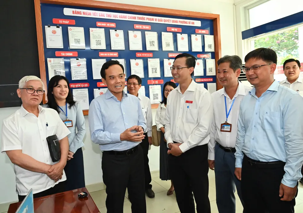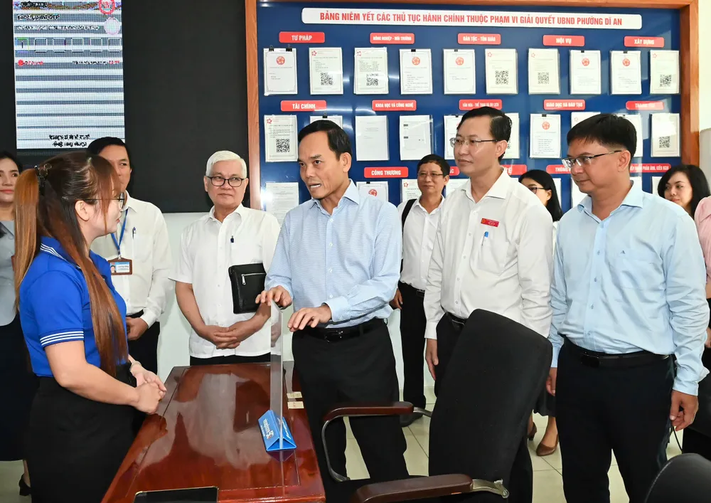 Bí thư Thành ủy TPHCM Trần Lưu Quang cùng đoàn công tác đến khảo sát tình hình hoạt động của Trung tâm Phục vụ hành chính công phường Dĩ An. Ảnh: VIỆT DŨNG