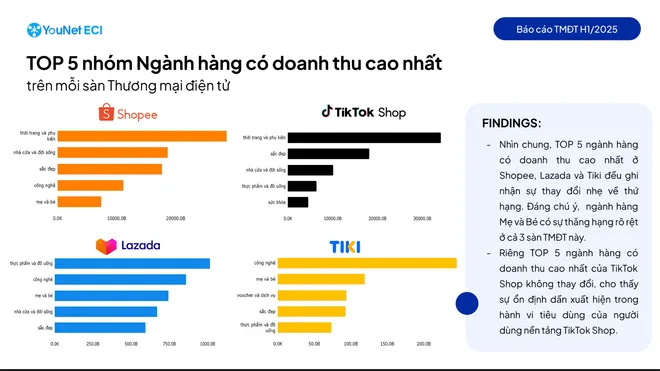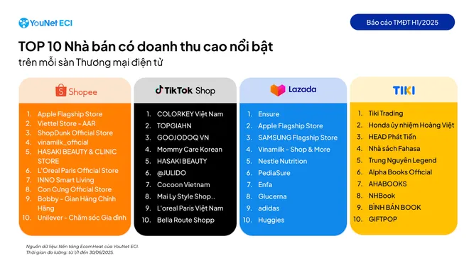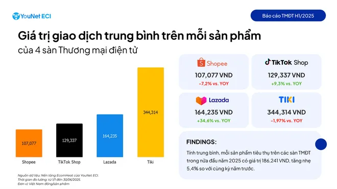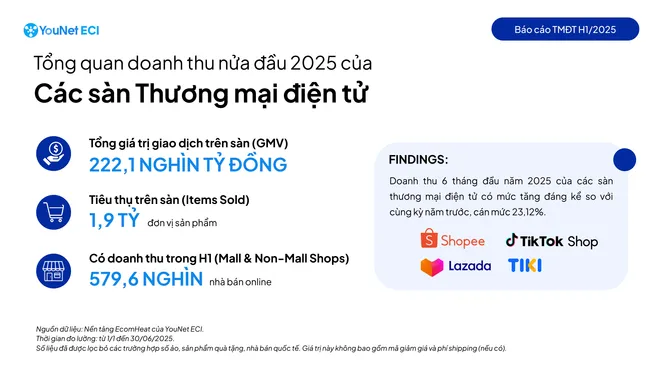 Báo cáo Doanh thu các sàn thương mại điện tử nửa đầu năm 2025 của YouNet ECI cho thấy thị trường tăng trưởng 23% so với cùng kỳ và doanh thu trung bình của các shop thương mại điện tử tăng 27,6%.