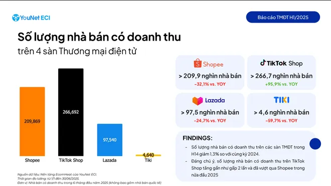 Không chỉ tăng trưởng GMV, số lượng nhà bán có doanh thu trên TikTok Shop trong nửa đầu năm 2025 tăng mạnh 96% so với cùng kỳ, đạt hơn 266.000 và lần đầu tiên vượt qua Shopee (Shopee có hơn 209.000 nhà bán, không tính nhà bán quốc tế).