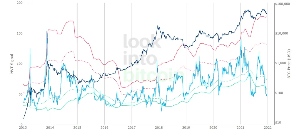 Biểu đồ tín hiệu Advanced NVT của Bitcoin (màu xanh lam nhạt) | Nguồn: LookIntoBitcoin.com