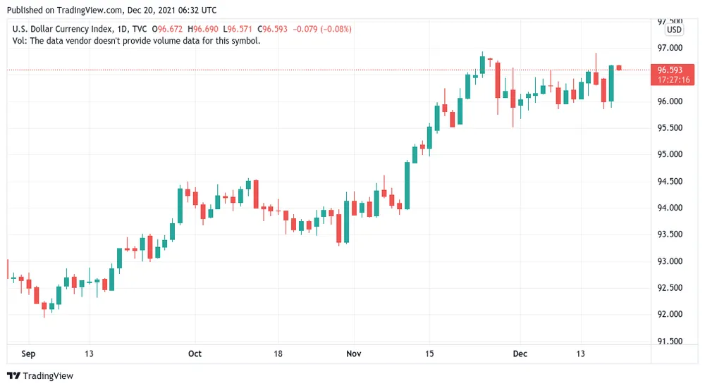 Chỉ số tiền tệ đô la Mỹ (DXY – đo lường sức mạnh của đô la Mỹ so với tiền tệ của các đối tác thương mại lớn) ở mức 96,6 vào thời điểm viết bài, gần chạm mức 97 vào cuối tuần trước.