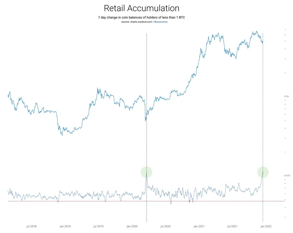 Nhà phân tích on-chain Willy Woo cũng phát hiện ra sự tích lũy của các nhà đầu tư bán lẻ tăng lên sau vụ tai nạn tháng 3 năm 2020, dẫn đến đợt tăng giá kéo dài hai năm của Bitcoin.