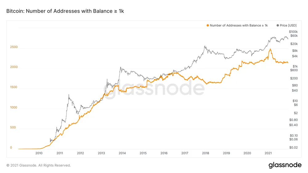 Trên thực tế, những địa chỉ ví chứa nhiều hơn hoặc bằng 1.000 BTC đã giảm dần trong năm 2021, từ 2.475 kể từ ngày 9 tháng 2 xuống 2.147 vào thời điểm hiện tại.