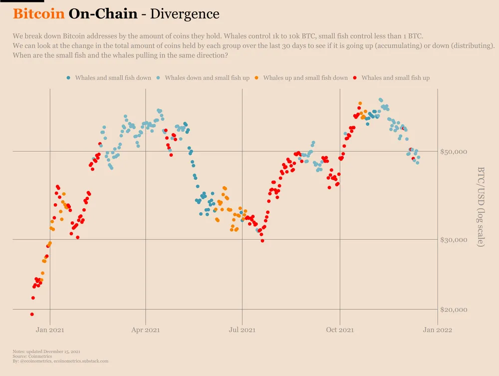“Bitcoin vẫn bị mắc kẹt trong tình huống mà các địa chỉ ví có số dư ít hơn 1 BTC sẵn sàng tích lũy, trong khi các địa chỉ cá voi không thực sự tích lũy”, Ecoinometrics lưu ý sau khi đánh giá sự thay đổi về lượng Bitcoin qua nhóm địa chỉ ví nhỏ và phong phú, như được hiển thị trong biểu đồ bên dưới.
