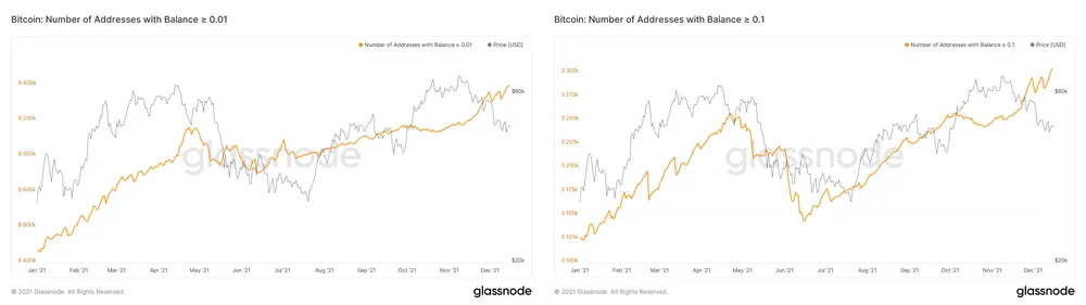 Tổng số địa chỉ có số dư ít nhất 0,01 BTC và 0,1 BTC | Nguồn: Glassnode