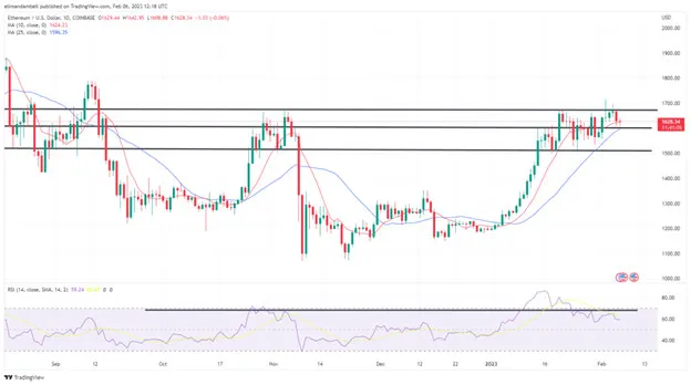 Sau mức cao 1.665,26 USD vào Chủ nhật 5/2, ETH/USD đã giảm tới 2% trong phiên hôm qua, chạm mức thấp 1.616,30 USD trong quá trình này.