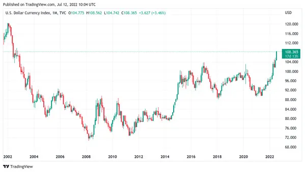DXY đạt đỉnh 108,47 vào ngày hôm qua 12/7, tăng vọt vào tuần mới và đạt mức mạnh nhất kể từ tháng 10-2002.