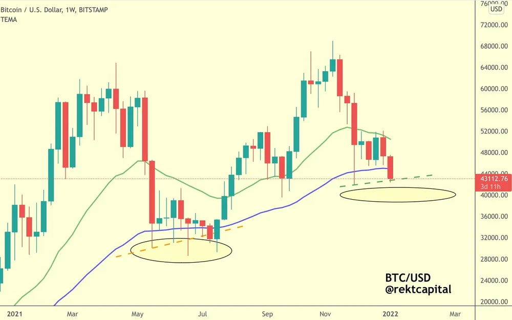 Dựa trên phần khoanh tròn được cung cấp trên biểu đồ, Rekt Capital nhận thấy có khả năng Bitcoin giảm xuống phạm vi 40.000 đô la.