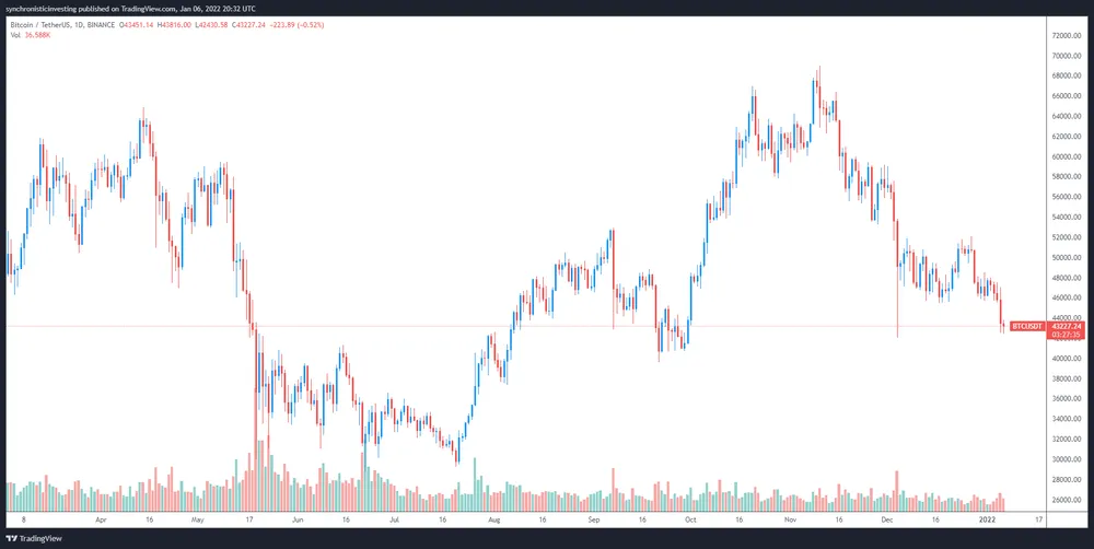 Dữ liệu từ TradingView cho thấy phe gấu đã cố gắng để khống chế thị trường vào ngày 5 tháng 1, đưa giá Bitcoin xuống mức 42.439 đô la.