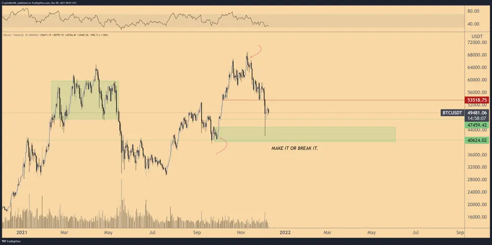 Nhà đầu tư chuyên nghiệp và cộng tác viên Cointelegraph, Michaël van de Poppe cũng đang theo dõi hành động giá xung quanh các mức hỗ trợ quan trọng này và đã đăng biểu đồ sau đây phác thảo mức hỗ trợ “tạo ra hay phá vỡ” trong mức thấp hơn 40.000 đô la.