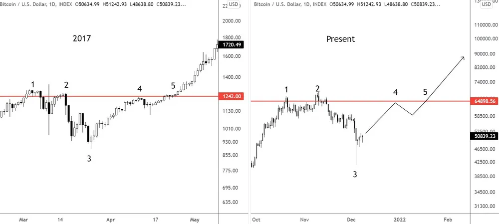 Biểu đồ giá BTC/USD 2017 so với giá BTC/USD hiện tại. Nguồn: Twitter