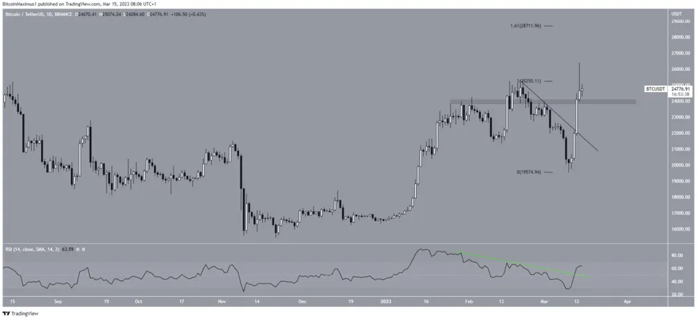 BTC đã đạt mức cao hàng năm mới vào ngày 14-3 nhưng đã tạo ra một bấc dài bên trên. Nếu mức tăng tiếp tục, ngưỡng kháng cự tiếp theo sẽ là 28.711 USD. Mặt khác, việc đóng cửa dưới vùng hỗ trợ 24.000 USD có thể dẫn đến việc giảm xuống còn 21.000 USD.