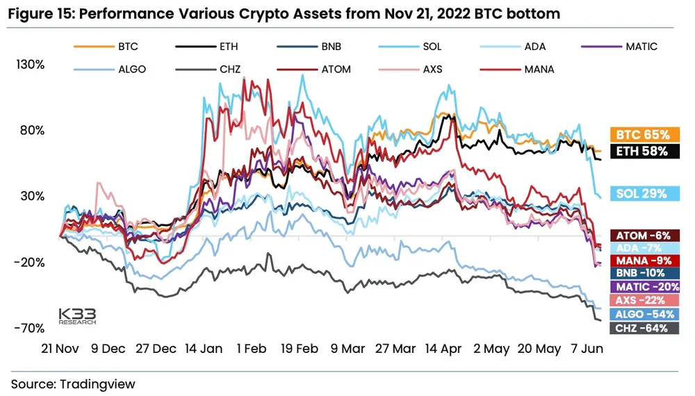 Altcoin – một thuật ngữ chung cho các loại tiền điện tử ngoài Bitcoin – đã bị bán tháo mạnh vào tuần trước khi Ủy ban Chứng khoán và Giao dịch Hoa Kỳ (SEC) coi nhiều token là chứng khoán trong các vụ kiện chống lại các sàn giao dịch tiền điện tử Binance, Binance.US và Coinbase.