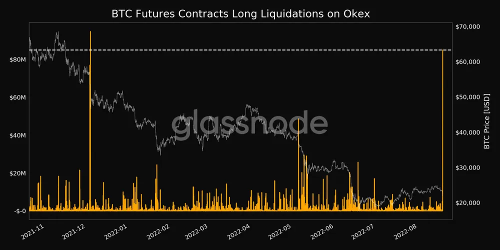 Các khoản thanh lý Long của BTC đã đạt mức cao nhất trong tám tháng là 84.934.697,05 USD trên sàn OKX, phá vỡ mức cao trước đó là 48.630.183,66 USD được ghi nhận vào ngày 5-5.