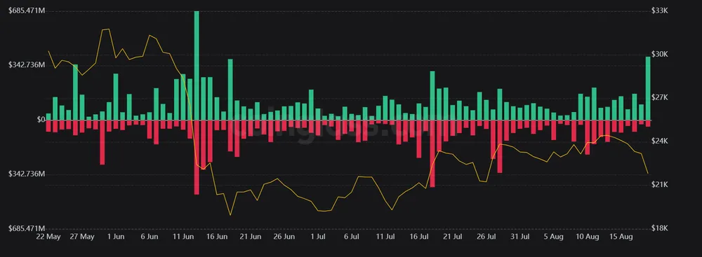 Biểu đồ sau cho thấy số lượng các vị thế Long bị thanh lý nhiều hơn các vị thế Short với một biên độ đáng kể, cho thấy rằng tâm lý thị trường rất lạc quan cho đến khi sụp đổ. Giá trị của các vị thế bán thanh lý chỉ là 41 triệu USD so với 398 triệu USD ở các vị thế mua.