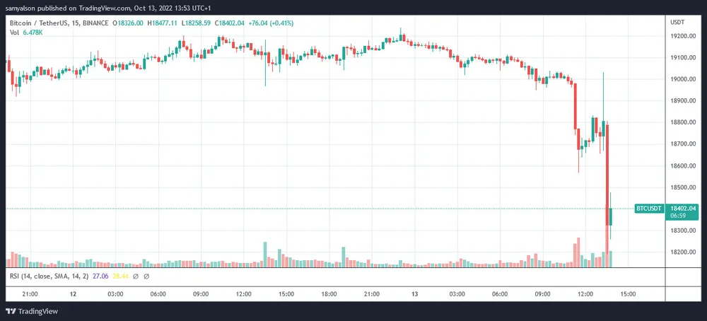 Cú bật lên sau đó đã dẫn đến một đợt phục hồi mạnh mẽ, khôi phục lại một số khoản lỗ. Động thái này đạt đỉnh ở mức 19.000 USD trước khi Hoa Kỳ công bố CPI của tháng 9 và phe gấu nắm quyền kiểm soát dẫn đến mức giảm ngay lập tức xuống 18.200 USD.