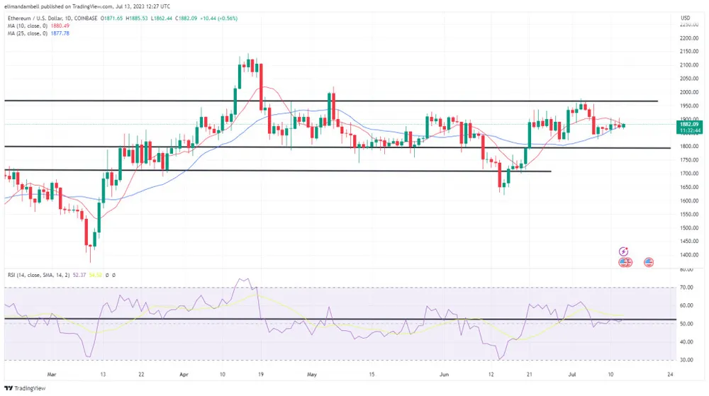 Sau mức cao 1.901,15 USD vào thứ Tư 12/7, ETH/USD đã giảm xuống đáy ở mức 1.864,50 USD trước đó trong phiên hôm qua.