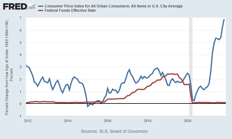 Biểu đồ về lạm phát của Fed trong 10 năm qua rất thú vị. Kể từ đại dịch, được đánh dấu bằng màu xám, mức lạm phát đã giảm mạnh trước khi bắt đầu tăng chóng mặt lên 7%.