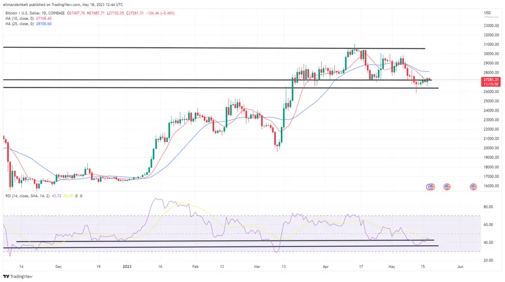 Sau mức thấp 26.600,14 USD vào thứ Tư (17/5), BTC/USD đã tăng lên mức cao nhất trong ngày là 27.465,93 USD vào đầu ngày.