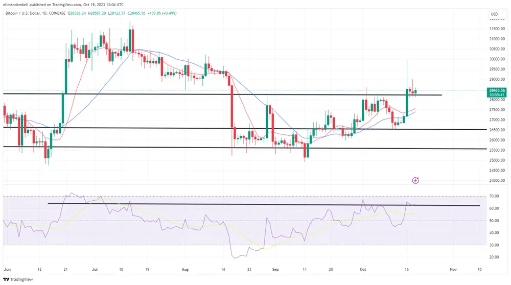 BTC/USD đạt đỉnh 28.566,75 USD khi có tin tức, sau mức thấp 28.174,25 USD trong phiên thứ Tư 18/10.
