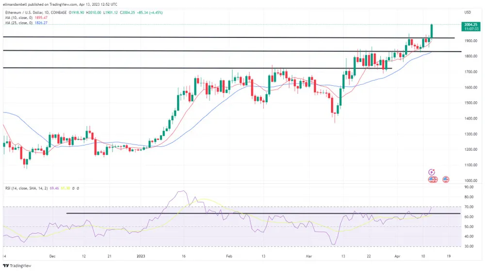 ETH/USD đã tăng lên mức cao nhất là 2.007,05 USD trước đó trong phiên hôm qua, chưa đầy một ngày sau khi giao dịch ở mức 1.882,37 USD.