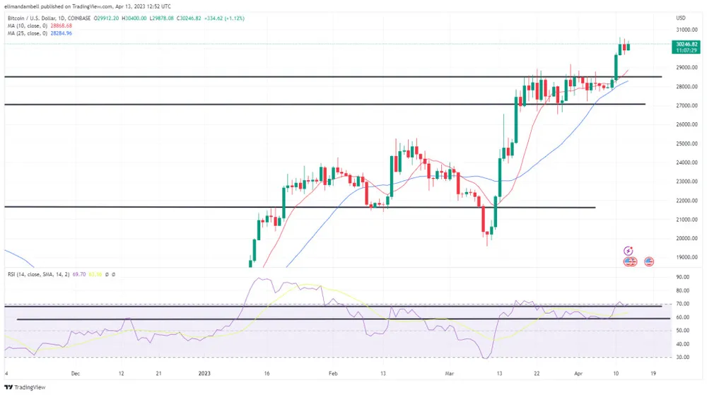 Động thái này cho thấy Bitcoin vẫn ở gần mức cao nhất trong 10 tháng là 30.584 USD, mà vua coin đã đạt được trong phiên giao dịch hôm thứ Ba (11/4).