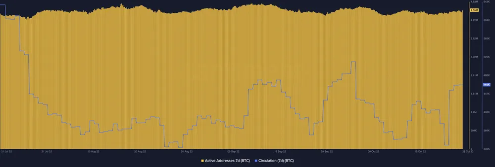 Mặc dù dữ liệu sàn giao dịch thấp, lưu thông của Bitcoin gần đây tương đối ấn tượng. Dữ liệu của Santiment cho thấy lưu thông trong 7 ngày là 2,1 triệu vào thời điểm viết bài. Trước đó, lượng lưu thông chỉ đạt 114.000.
