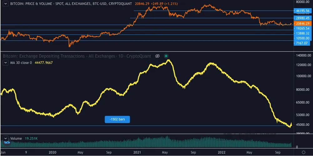 Theo cách tương tự, nhà phân tích Tomáš Hančar của CryptoQuant đã lưu ý về việc này. Theo anh, thiếu tiền gửi vào sàn cho thấy các nhà đầu tư bán lẻ ít quan tâm đến việc tích lũy BTC.