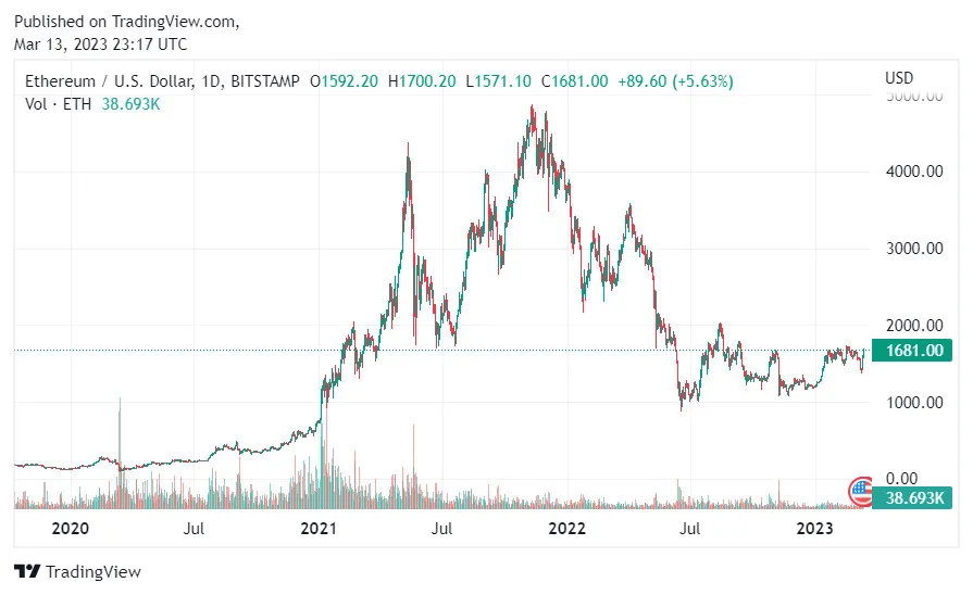 ETH/USD đã tăng lên mức cao nhất trong ngày là 1.629,37 USD vào đầu ngày hôm qua, chưa đầy 24 giờ sau khi giảm xuống mức thấp nhất là 1.468,74 USD.