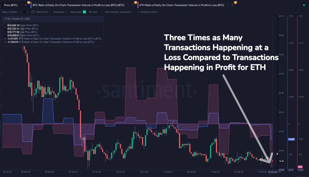 Cả Bitcoin và Ethereum đều chứng kiến các giao dịch lớn xảy ra trong khi các trader thua lỗ rất lớn. Theo Santiment, Bitcoin đã chứng kiến tỷ lệ giao dịch thua lỗ so với lợi nhuận thấp nhất trong 4,5 tháng và Ethereum ghi nhận mức thấp nhất trong lịch sử.
