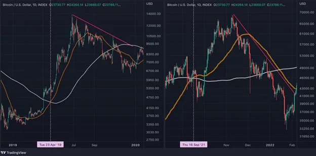 Giá BTC tăng đáng kinh ngạc sau Golden Cross vào tháng 4-2019 và tháng 9-2021. Nhưng những động thái tăng này chỉ là thoáng qua.