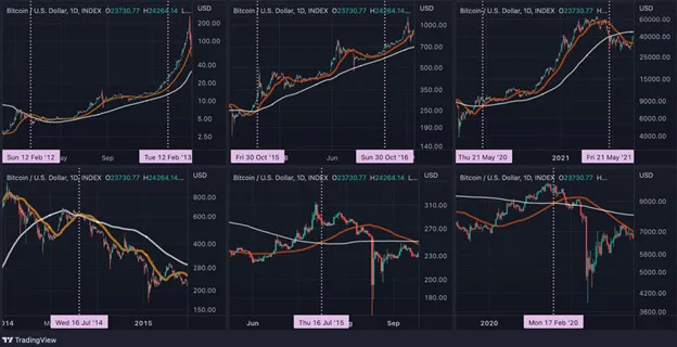 Mặt khác, các điểm giao cắt vào tháng 7-2014, tháng 7-2015 và tháng 2-2020 là bẫy bò vì tiền điện tử hàng đầu về vốn hóa lao vào Death Cross (giao cắt tử thần) trong những tuần/tháng tiếp theo. Death Cross đối lập với Golden Cross và báo hiệu giá chuyển sang giảm trong xu hướng dài hạn.