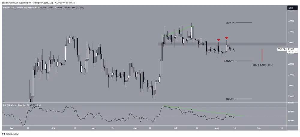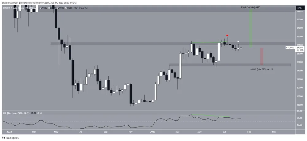 Phân tích kỹ thuật từ khung thời gian hàng tuần của BTC cho thấy triển vọng giảm giá. Lý do chính cho điều này là do giá bị vùng kháng cự 30.500 USD từ chối và mức giảm tiếp theo (biểu tượng màu đỏ). Sự từ chối cũng tạo ra một bấc dài phía trên, được coi là dấu hiệu của áp lực bán.