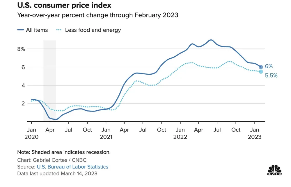 Theo báo cáo của Bộ Lao động Mỹ, chỉ số giá tiêu dùng (CPI) tăng 0,4% trong tháng 2, đưa tỷ lệ lạm phát cả năm lên 6%, phù hợp với ước tính của Dow Jones. Nếu loại trừ giá lương thực và năng lượng, CPI lõi của Mỹ tăng 0,5% trong tháng 2 và tăng 5,5% trong 12 tháng qua.
