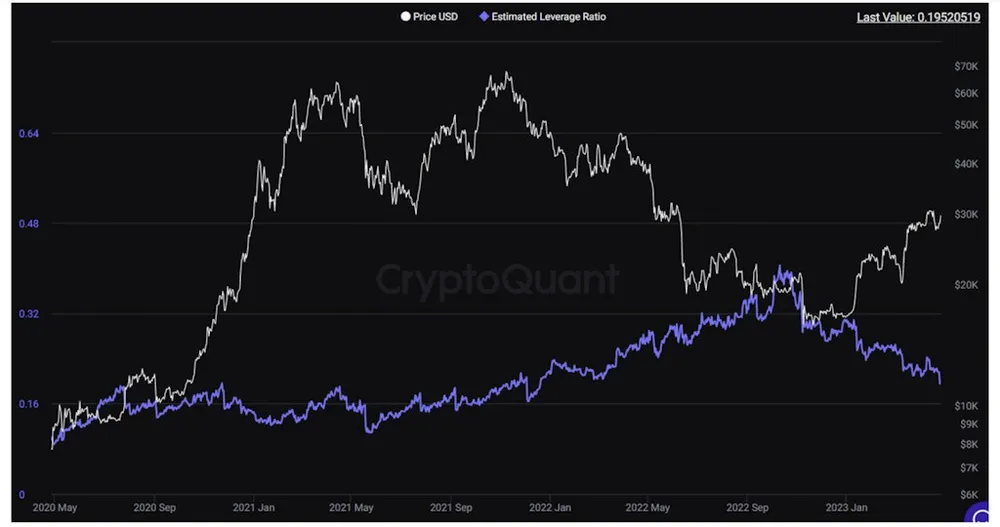 “Tỷ lệ đòn bẩy ước tính” đo lường đòn bẩy trong thị trường Bitcoin. Tỷ lệ này đã giảm xuống mức thấp 0,195 vào tuần trước, mức chưa từng thấy kể từ ngày 20/12/2021. Vào thời điểm này, Bitcoin giảm 12% chỉ trong vài ngày, từ 56.500 USDxuống còn 49.500 USD, trùng hợp với việc giảm đòn bẩy.