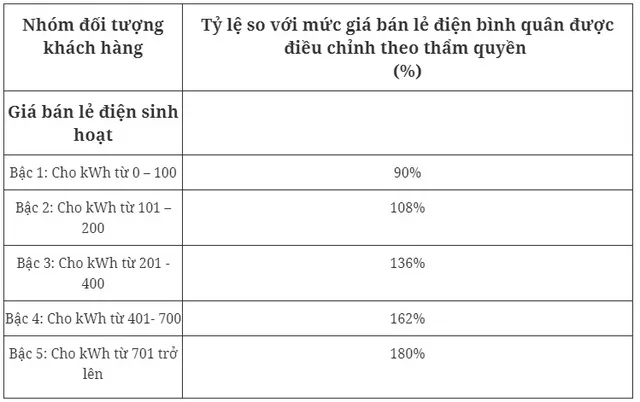 Giá bán lẻ điện cho nhóm khách hàng sử dụng điện sinh hoạt gồm 5 bậc có mức giá tăng dần nhằm khuyến khích sử dụng điện tiết kiệm, hiệu quả.