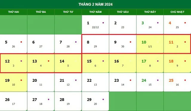 Theo đó, cán bộ, công chức, viên chức nghỉ Tết Nguyên đán Giáp Thìn 2024 trong 7 ngày, từ ngày 8/2/2024 (29 tháng Chạp) đến hết ngày 14/2/2024 (mùng 5 tháng Giêng).