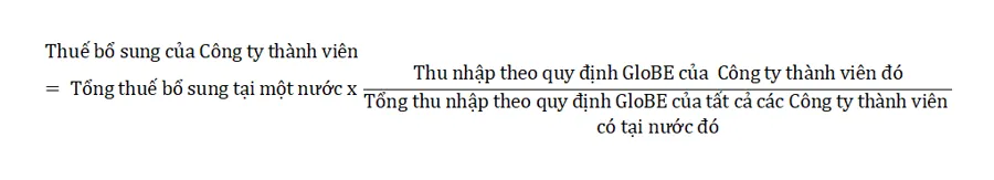 Thuế bổ sung của công ty thành viên sẽ được xác định cho mỗi công ty thành viên của một nước có thu nhập GloBE trong năm tính thuế được đưa vào khi tính thu nhập ròng theo quy định GloBE tại nước đó theo công thức sau: