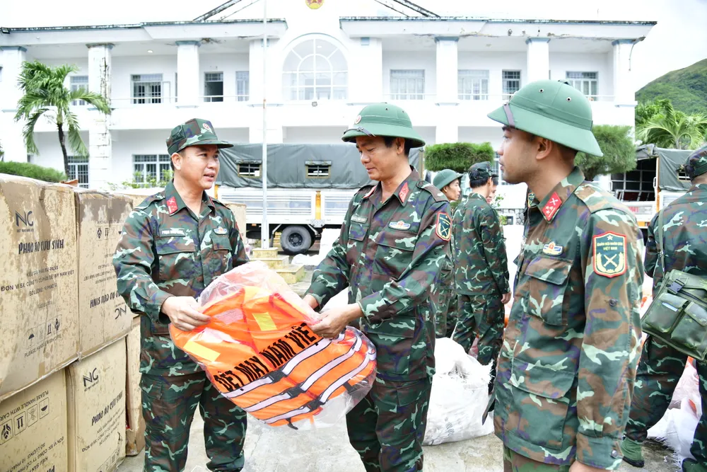 Lực lượng vũ trang TPHCM mang áo phao và phao cứu sinh hỗ trợ nhân dân tỉnh Khánh Hòa. Ảnh: HỮU TÂN