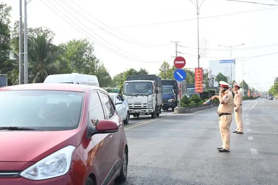 Sáng 29-4, mật độ phương tiện giao thông lưu thông qua cầu Rạch Miễu hướng từ Tiền Giang đi Bến Tre tăng đột biến, lực lượng cảnh sát giao thông (CSGT) phân luồng, điều tiết lưu thông 1 chiều để giải phóng lượng xe ùn ứ.
