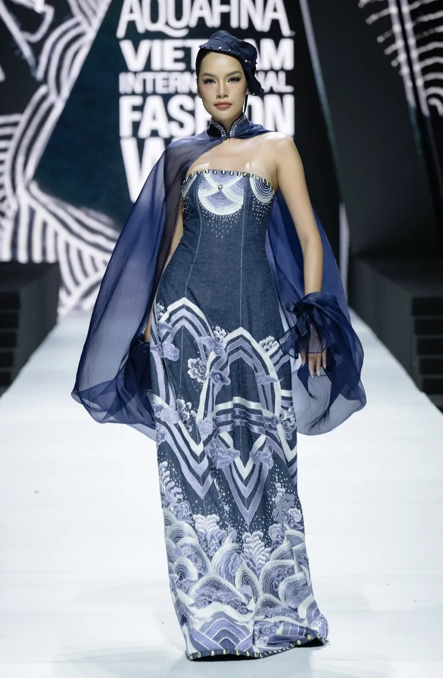 Thay vì mỗi bộ sưu tập chỉ tập trung thiết kế những trang phục đồng nhất thì NTK Vũ Việt Hà lại đặt “bài toán khó” cho chính bản thân khi mang đến nhiều mẫu trang phục khác nhau trong cùng một BST. Chú trọng đến những thiết kế mang yếu tố di sản văn hóa kết hợp chất liệu thân thiện với môi trường, NTK Vũ Việt Hà cũng không quên tạo nên những “tuyệt tác” mang dòng chảy của hiện đại từ chất liệu chủ đạo là vải gai xanh Thiên Phước. Từ đó tạo nên điểm nhấn với các sắc độ đậm nhạt khác nhau từ tông màu đơn sắc đến xanh navy chuyển ghi sang trắng tái hiện “dòng nước” trên trang phục cổ Việt Nam một cách sống động nhất.