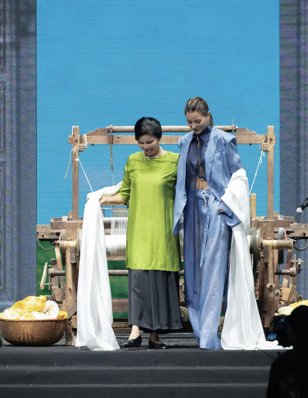 NTK Vũ Thu Phương mang đến BST Green Phoenix với những thiết kế sang trọng khi sử dụng chất liệu lụa truyền thống, khán giả như hòa mình vào không gian văn hóa, nghệ thuật tại làng nghề Cổ Chất, Nam Định. Với xu hướng thời trang bền vững đã và đang phát triển, Vũ Thu Phương tìm thấy ý tưởng thiết kế với hành trình “sống xanh", lấy cảm hứng từ làng nghề truyền thống với việc trồng dâu, nuôi tằm dệt lụa.