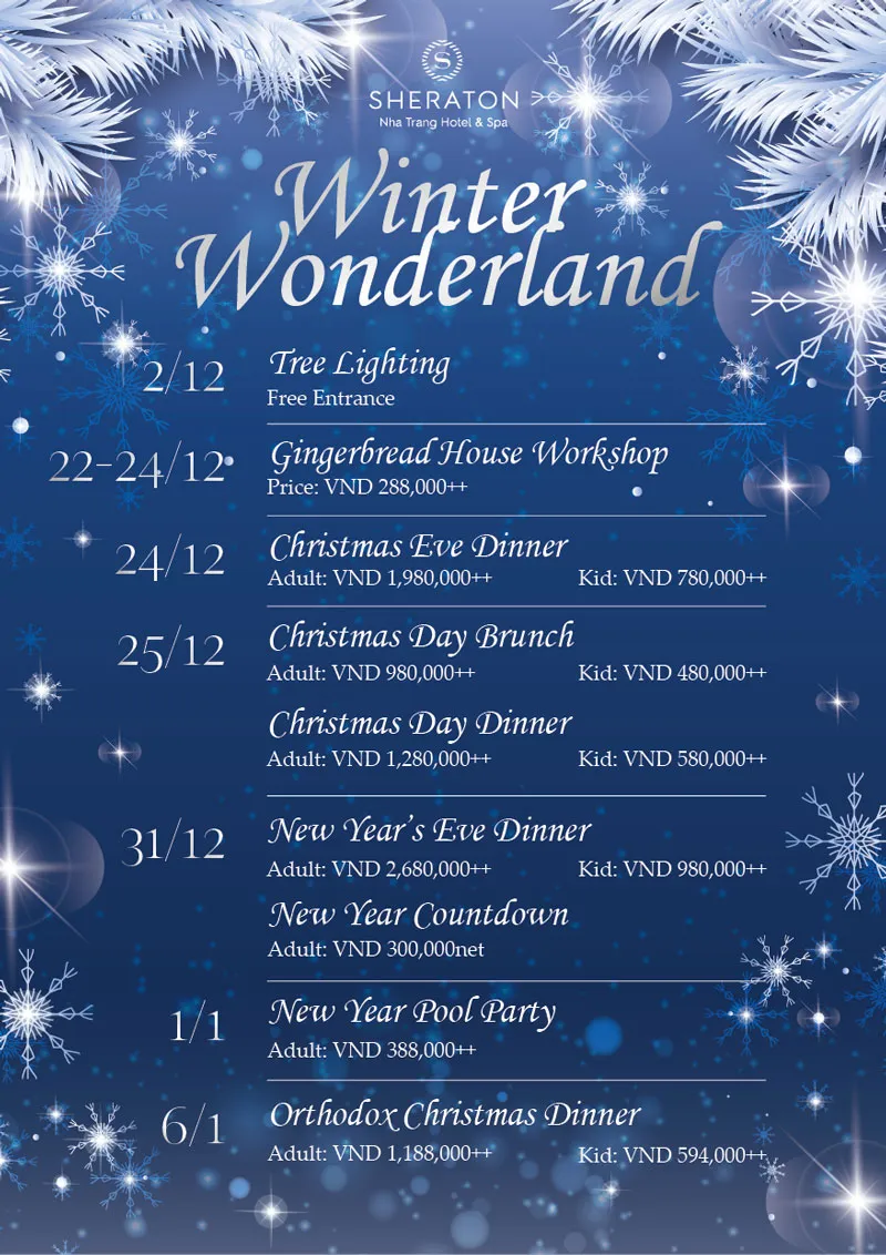 Nếu bạn đang lưu trú tại khách sạn hay có dịp khám phá thành phố Nha Trang trong thời điểm tháng 12, đừng quên ghé Sheraton Nha Trang Hotel & Spa khi khách sạn đang khoác lên mình chiếc áo đầy mê hoặc của mùa đông và tham gia vào các hoạt động đặc sắc tại khách sạn.